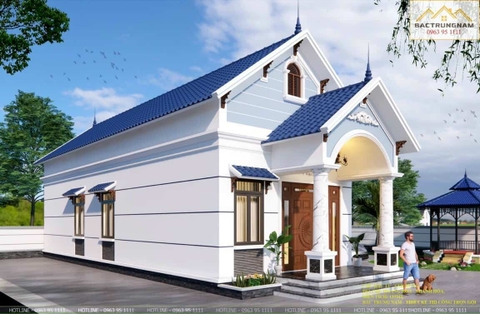 Bên trên mái vòm được trang trí hoa văn mang đậm chất cổ điển, xua đi sự đơn điệu của hệ thống mái và tạo thành điểm nhấn cho cả căn nhà cấp 4 mái Thái chữ L. Mảng trên mái vòm được sơn màu xanh nhạt, kết hợp với tổng thể màu trắng tạo nên một tổng thể hài hòa.